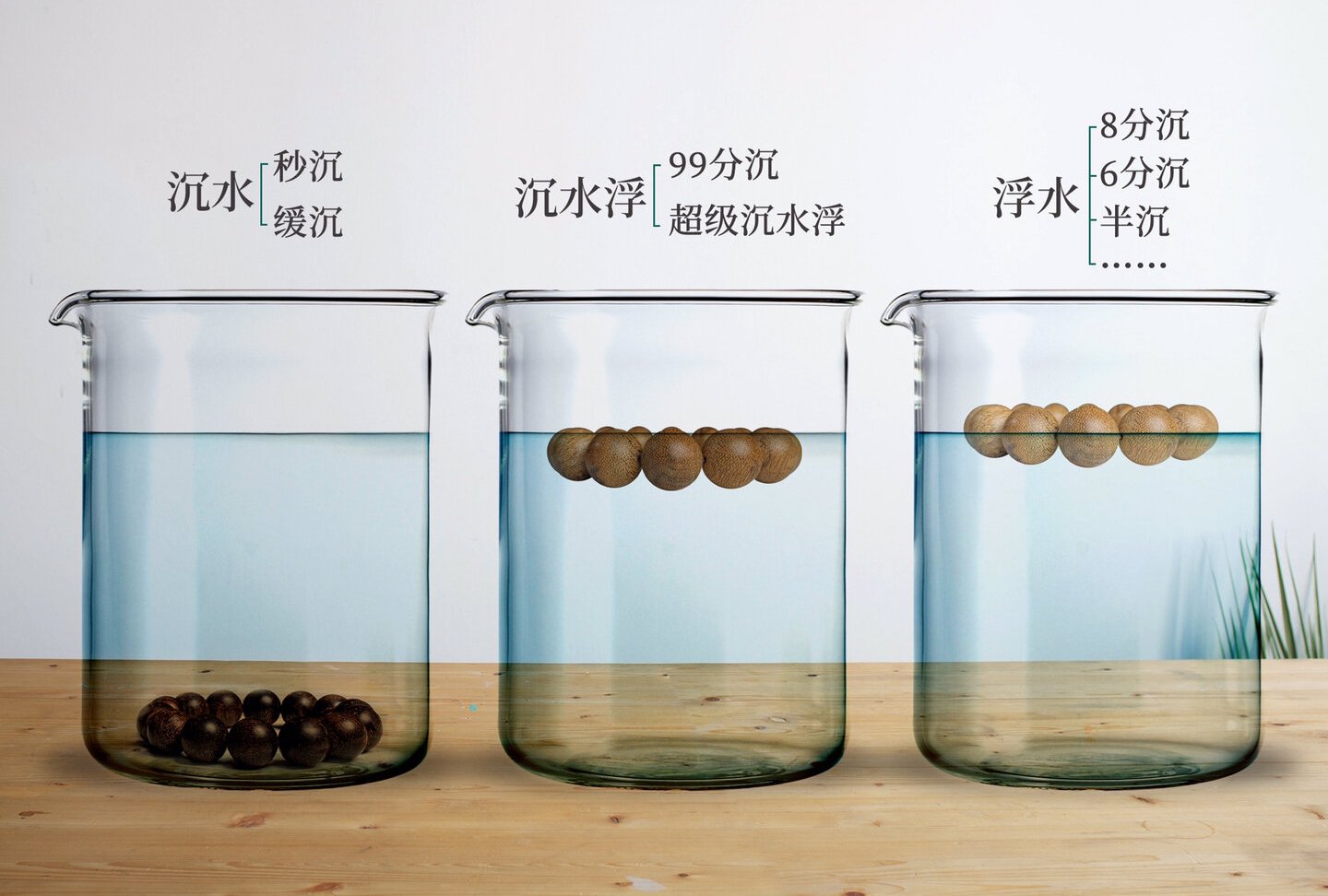 沉香因各种自身生病或外部刺激的不同,结成树脂的质量与密度也有所不同。通常油脂密度较高、油脂含量约有25%以上的沉香会沉到水底,因而被称为「沉水沉香」。