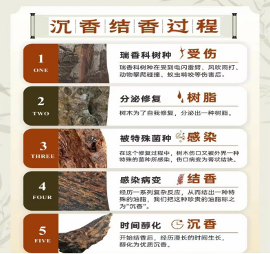 沉香树和一般植物皆相同,当遭受虫害、细菌感染或各种自然灾害时,会启动自身的防御机制,以修复伤口并保护树木。